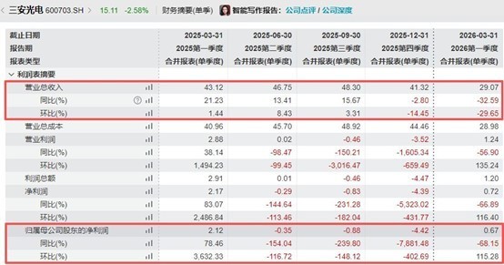 环比来看,三安光电2026年一季度营收较去年第四季度下滑29.65%,归母净利润则环比扭亏为盈。