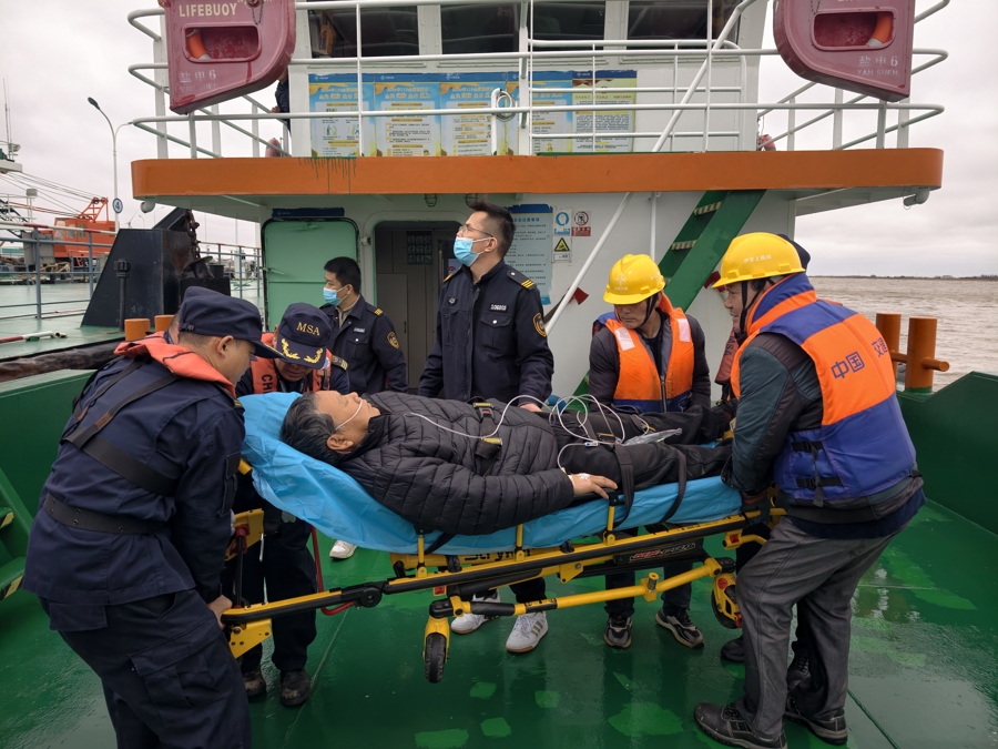执法人员一边联系家属和医护人员,了解伤情并指导送抵指定码头,一边与船方确认航线、对接岸上救护资源。拖轮抵达横沙岛后,考虑到骨折伤情的特殊性,在做好充分固定和确保身体平衡的前提下,现场人员齐心协力将其转运至拖轮上。16时50分,“长江口拖”轮靠妥长兴侧码头,执法人员与救护车高效对接,将伤员安全转移至救护车。